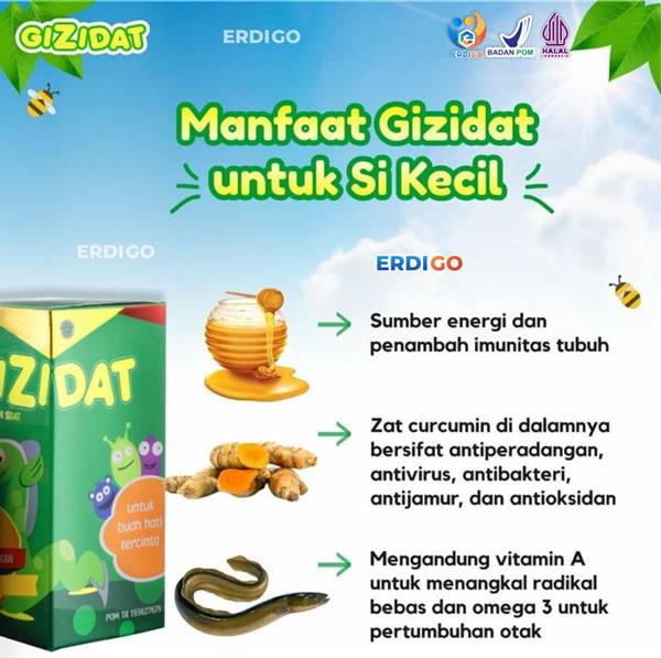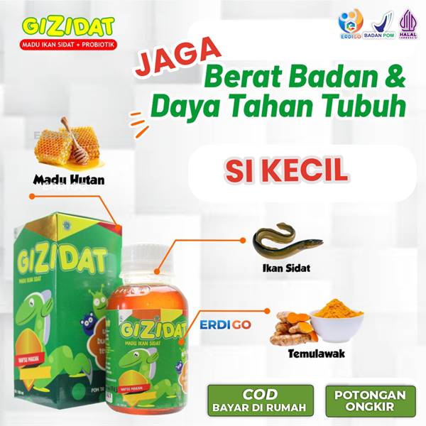 GIZIDAT adalah suplemen herbal anak yang diformulasikan dari madu hutan murni, ikan sidat, dan temulawak, khusus untuk membantu meningkatkan nafsu makan, menutrisi otak, serta memperkuat sistem imun anak secara alami.