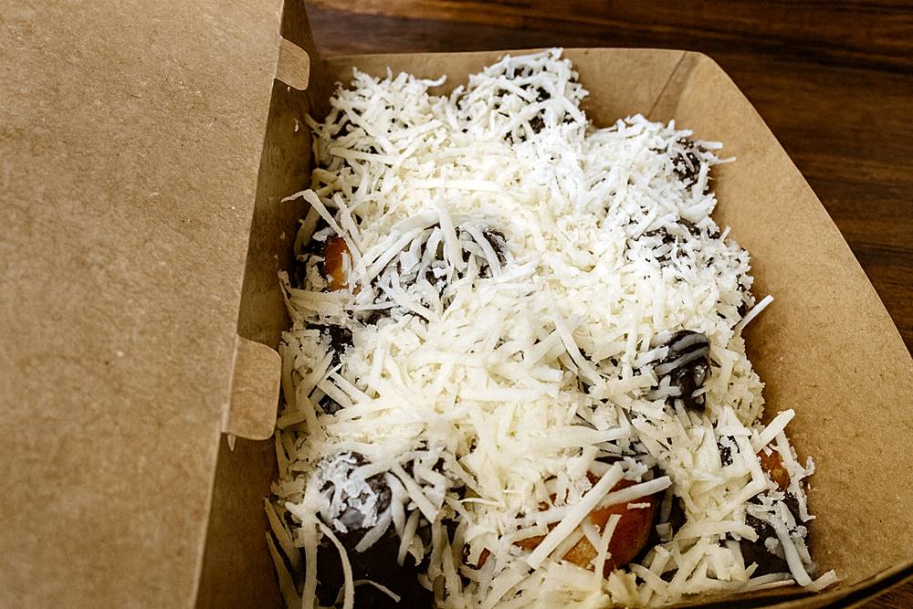 Nikmati lezatnya pisang kembung toping kombinasi cokelat keju ukuran besar.